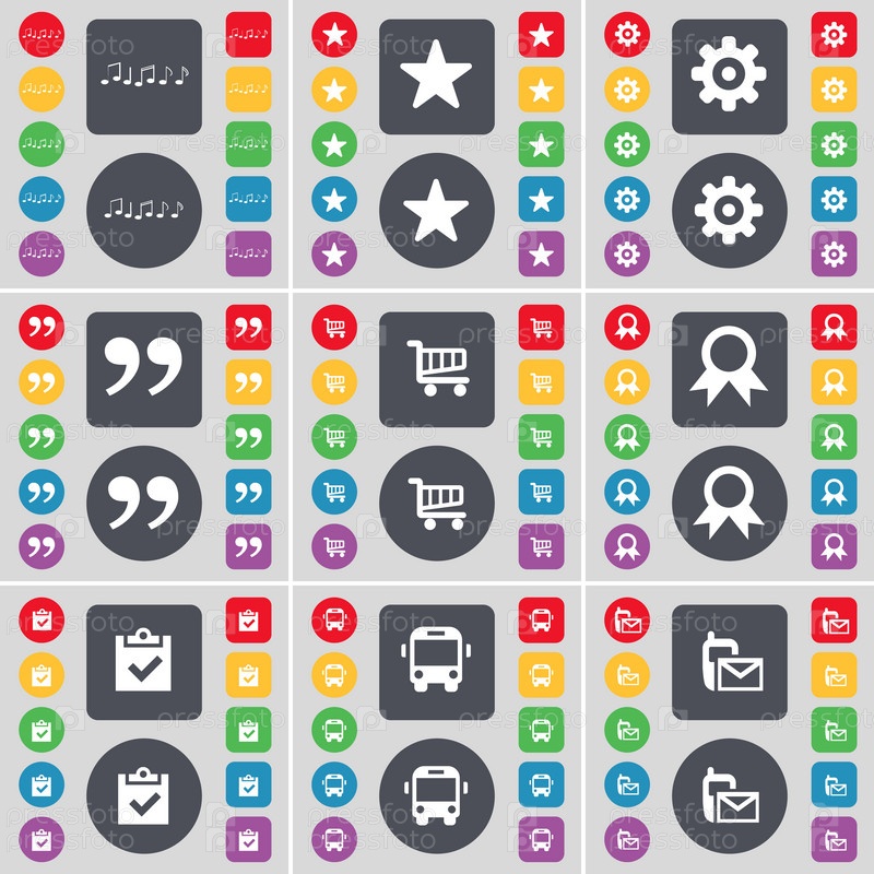 Примечание, звезда, снаряжение, запятые, корзина, медаль, обследования, автобус, символ значка SMS. Большой набор плоских цветных кнопок для вашего дизайна. вектор