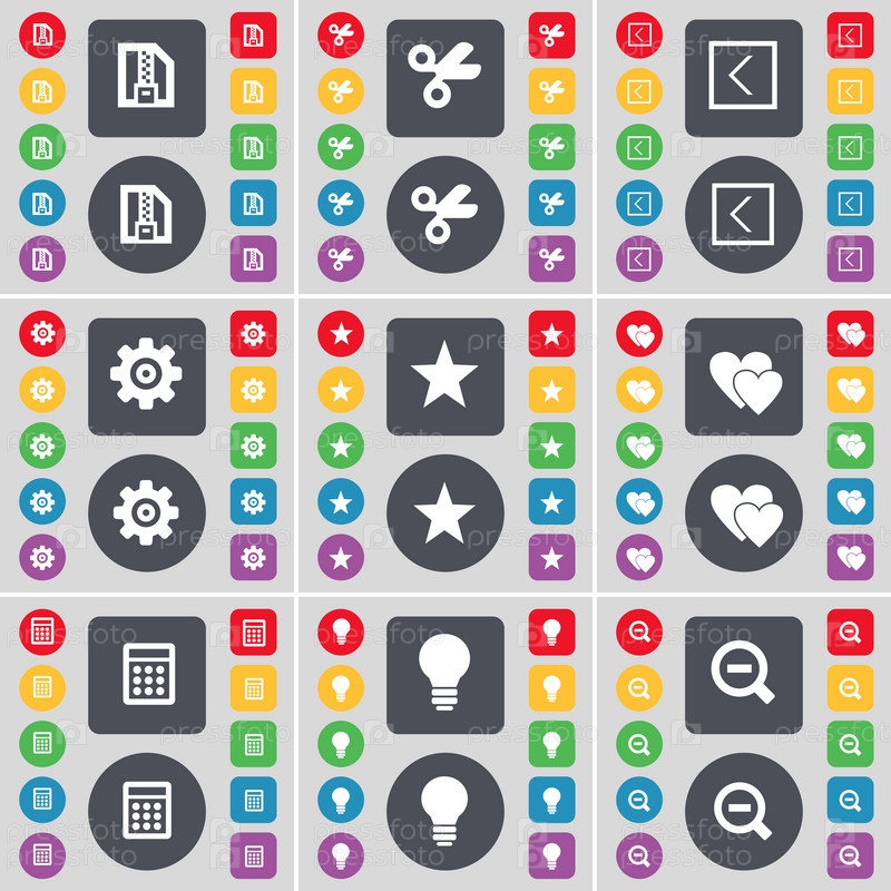ZIP-файл, ножницы, стрелка влево, Гир, звезды, сердца, калькулятор, световые лампы, символ значка увеличительного стекла. Большой набор плоских цветных кнопок для вашего дизайна. вектор