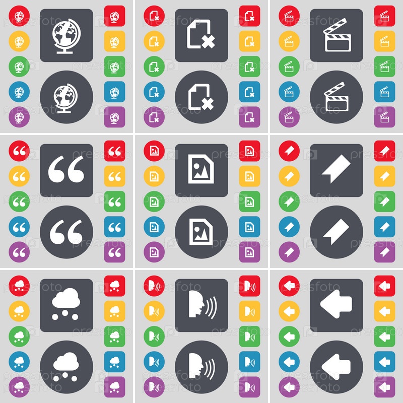 Глобус, файл, клаппер, запятые, мультимедийный файл, маркер, облако, разговор, стрелка слева от значка символа. Большой набор плоских цветных кнопок для вашего дизайна. вектор