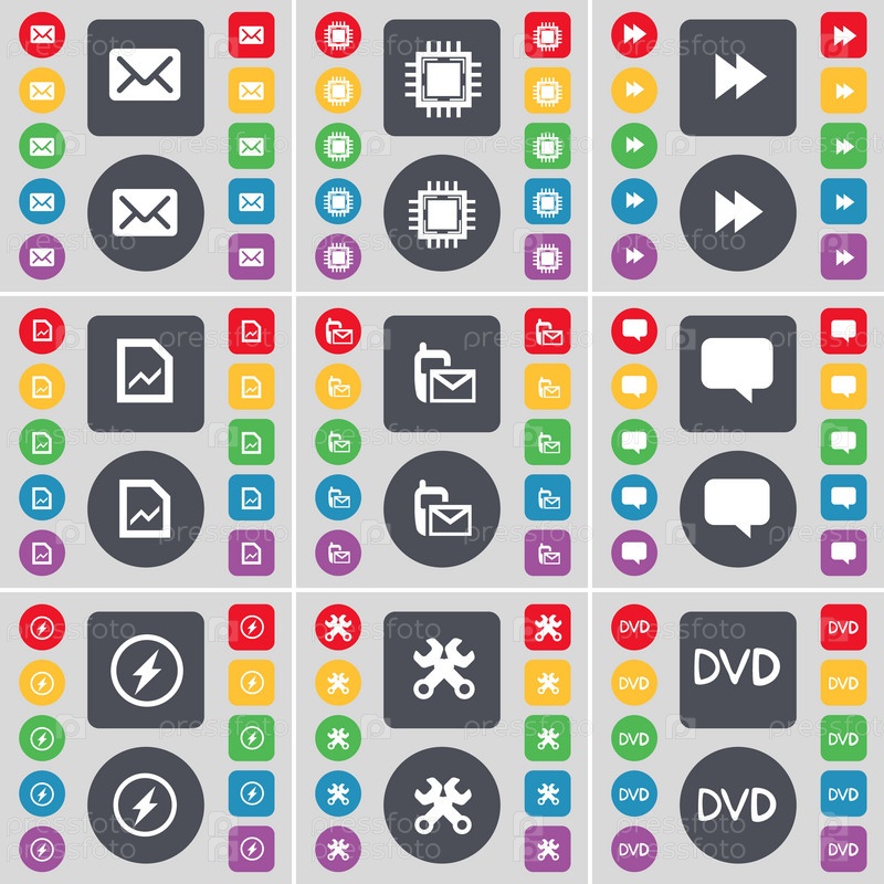 Сообщение, процессор, Rewind, файловый граф, SMS, пузырь чата, Флэш, гейковерт, значок символа DVD. Большой набор плоских цветных кнопок для вашего дизайна. вектор