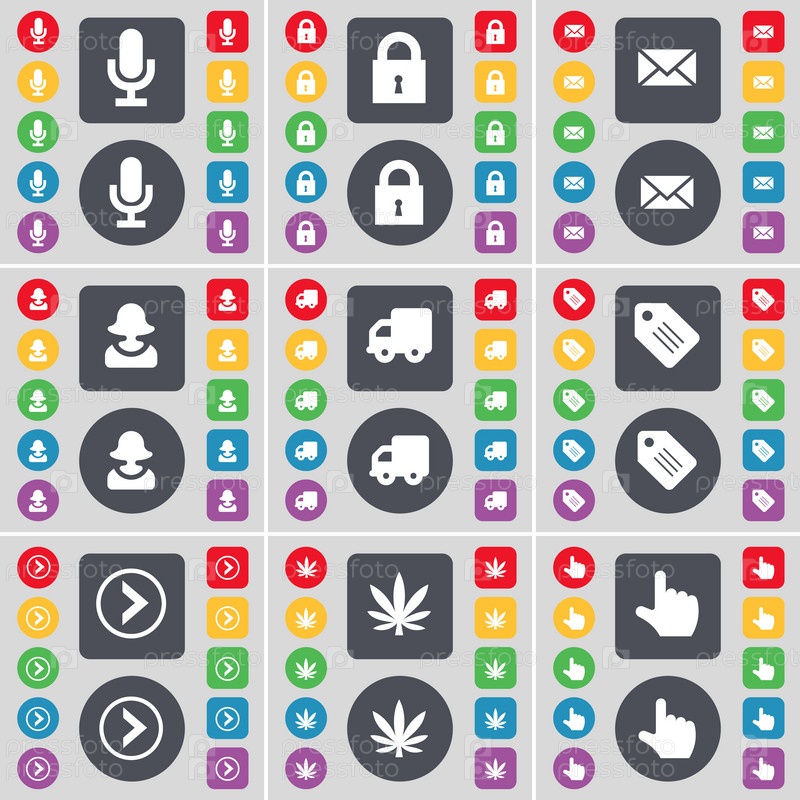 Микрофон, замок, сообщение, аватар, грузовик, тег, стрелку справа, марихуаны, символ значок руки. Большой набор плоских, цветные кнопки для вашего дизайна. Вектор
