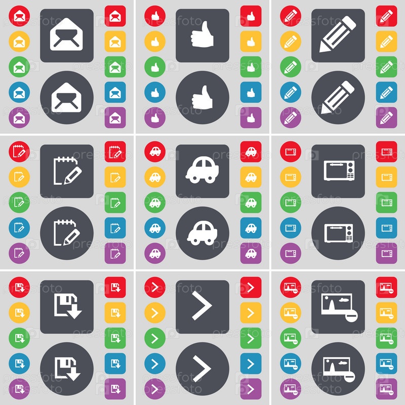Сообщение, как карандаш, блокнот, автомобиль, микроволновая печь, дискеты, символ r иконка. большой набор плоских цветных кнопок для вашего дизайна. вектор