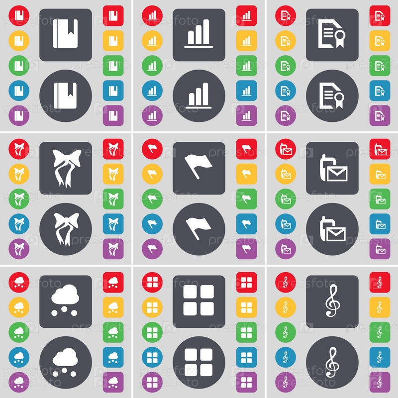 Словарь, диаграмма, текстовый файл, лук, флаг, SMS, облако, приложения, значок символа 'КЛЕЙ'. Большой набор плоских цветных кнопок для вашего дизайна. вектор