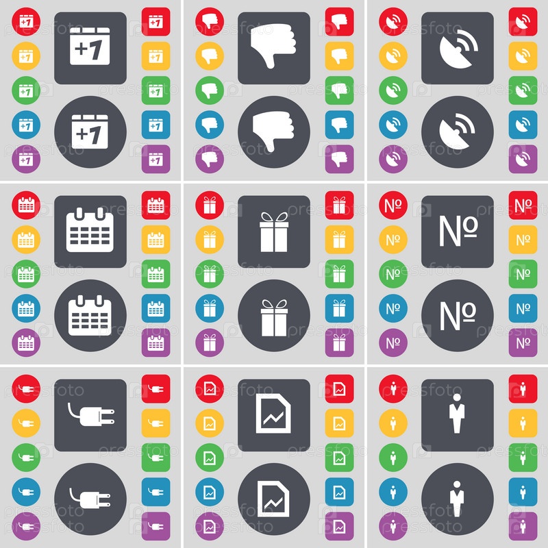 Плюс один, неприязнь, Спутниковая тарелка, календарь, подарок, номер сокета, файл графа, силуэт значок символа. Большой набор плоских, цветные кнопки для вашего дизайна. Вектор