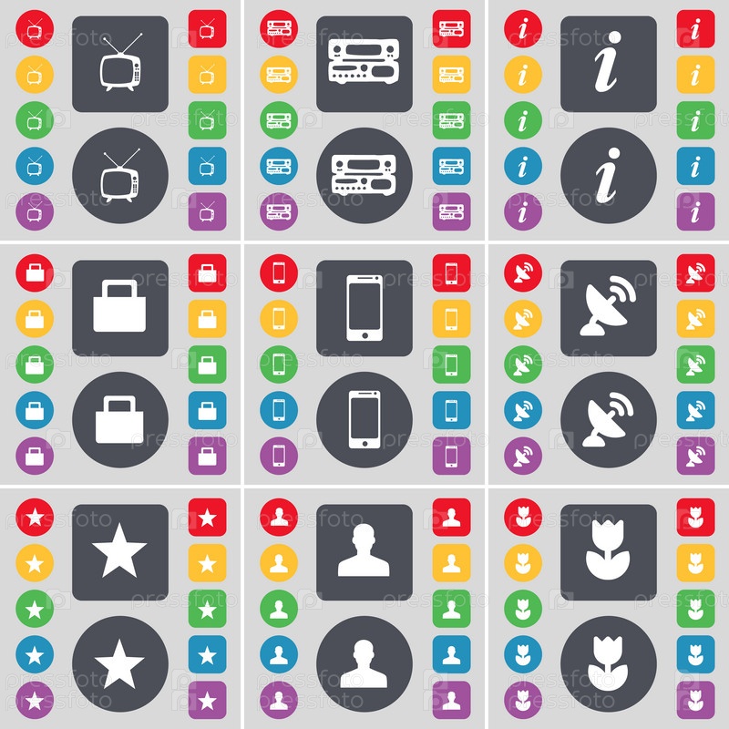 Ретро ТВ,-проигрыватель, Спутниковое блюдо, звезда, аватар, цветок значок символа. Большой набор плоских, цветные кнопки для вашего дизайна. Вектор