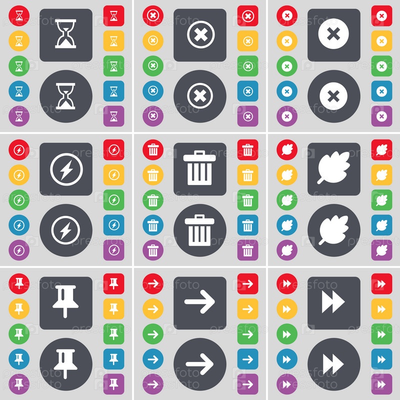 Песочные часы, остановка, Флэш, мусорный бак, лист, пин, стрелка направо, перевернуть значок символа. Большой набор плоских цветных кнопок для вашего дизайна. вектор