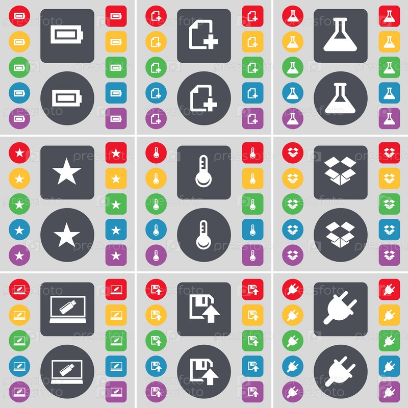 Аккумулятор, файл, флаг, звезда, термометр, Dropbox, ноутбук, дисковой коробка, значок символа разъема.Большой набор плоских цветных кнопок для вашего дизайна.Вектор