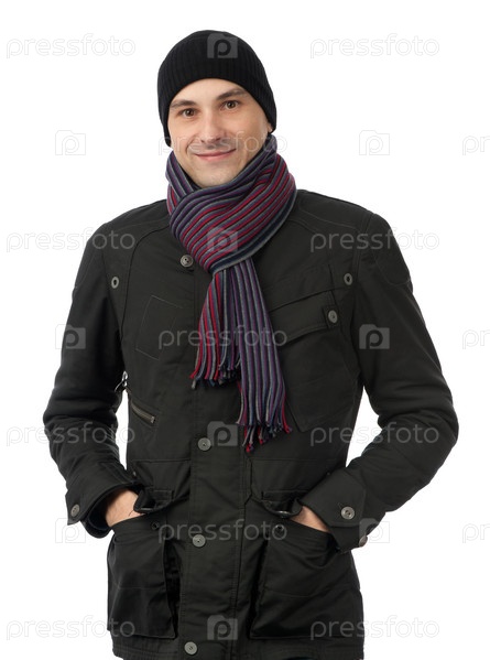 Улыбающийся мужчина в зимней одежде на белом фоне