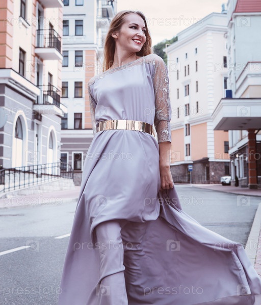 Красивая блондинка женщина в платье пешком