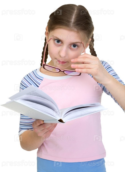 Школьница с очками и книгой на белом фоне