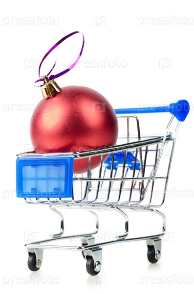 Новогодний блестящий шар в торговой тележке на белом фоне