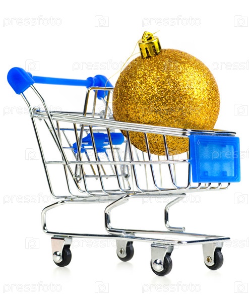 Новогодний блестящий шар в торговой тележке на белом фоне