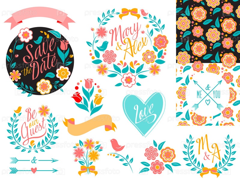 Большая свадьба графический набор, стрелы, сердца, Лорел, венки, ленты и этикетки