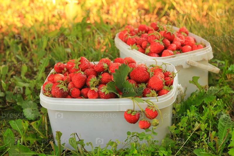 Спелые сладкие клубники в пластиковые корзины на зеленой лужайке