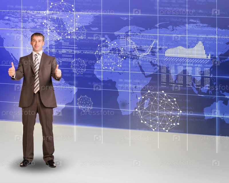 Бизнесмен, показывая ОК на абстрактный фон с картой мира и графиков