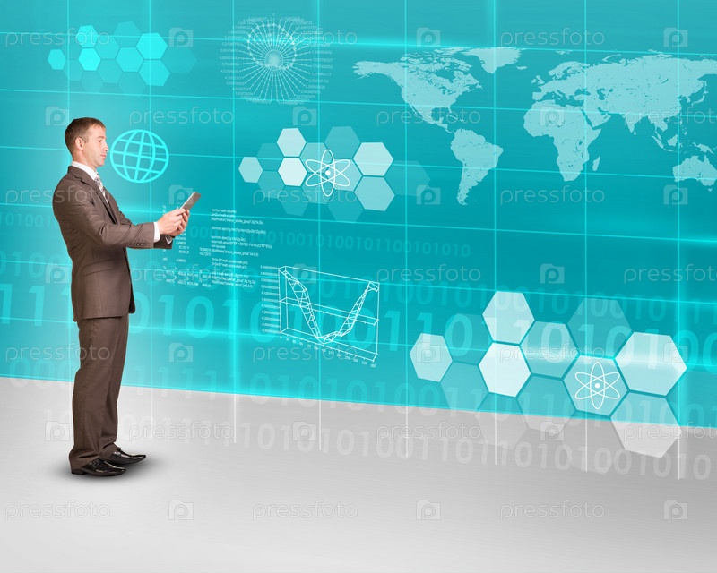 Бизнесмен с планшета на абстрактный фон с картой мира