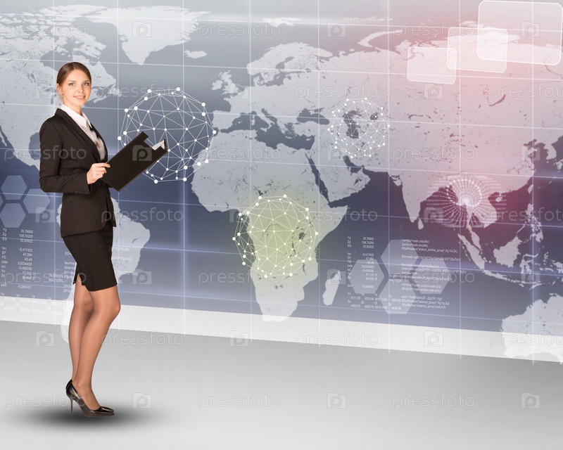 Бизнесмен с папки и пера, глядя на камеру на абстрактный фон с картой мира