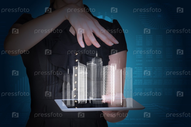 Бизнесмен с планшетом и 3D-моделью города
