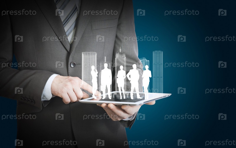 Таблетки холдинг бизнесмен с 3d моделью города