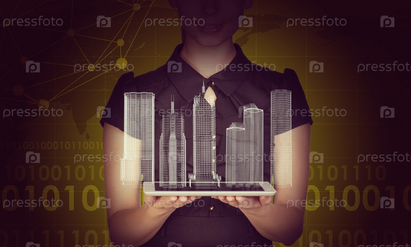 Предприниматель планшет и 3D-модель города