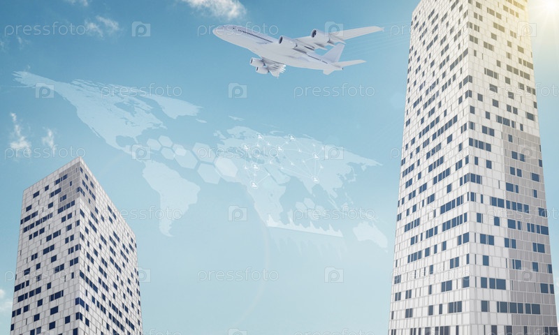 Две Бизнес-центр с и карта мира на фоне голубого неба