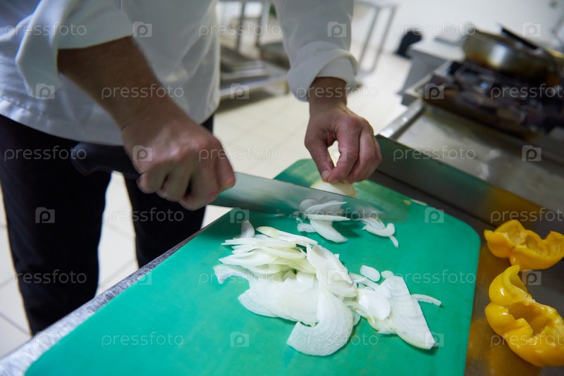 Шеф-повар в отеле кухня кусочек овощей с ножом