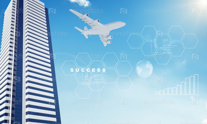 Земля и бизнес-центр на фоне голубого неба