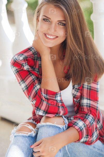 Счастливая девушка, одетая в джинсы и клетчатую рубашку