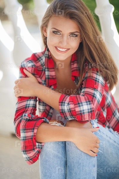 Счастливая девушка, одетая в джинсы и клетчатую рубашку