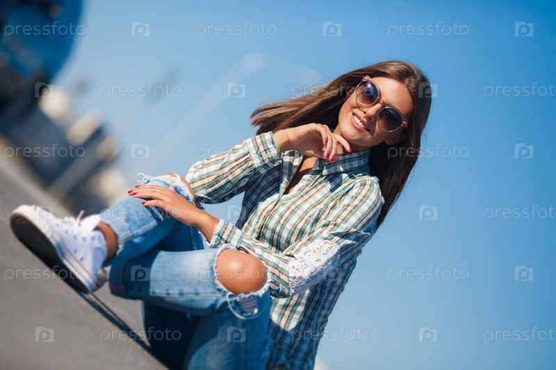 Счастливая девушка, одетая в джинсы и клетчатую рубашку