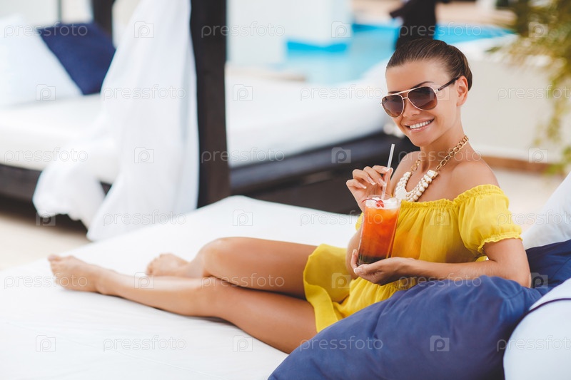Красивая женщина, отдыхающая с коктейлем