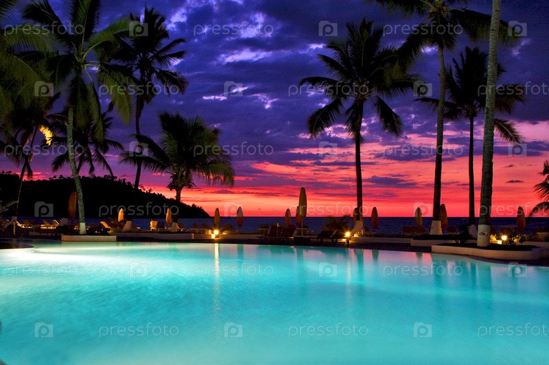 Бассейн и пальмы на закате