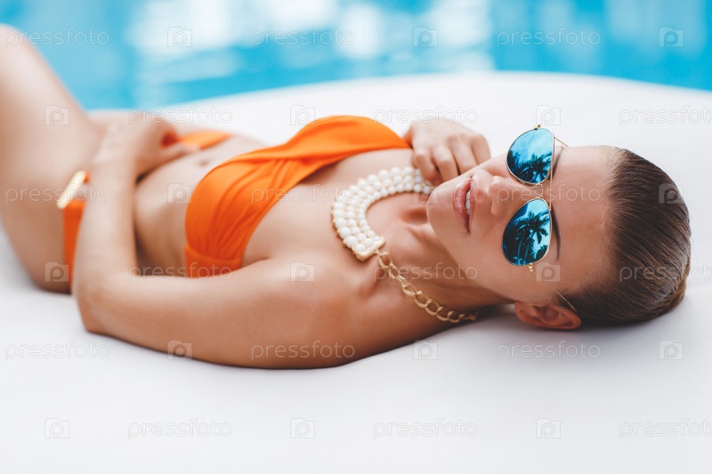 Красивая женщина в оранжевом купальнике