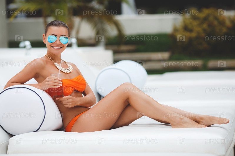 Красивая женщина в оранжевом купальнике