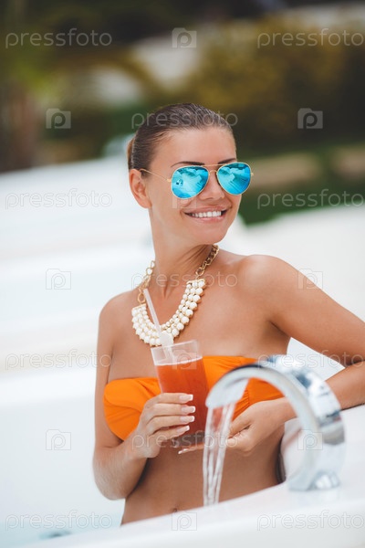 Красивая женщина в оранжевом купальнике