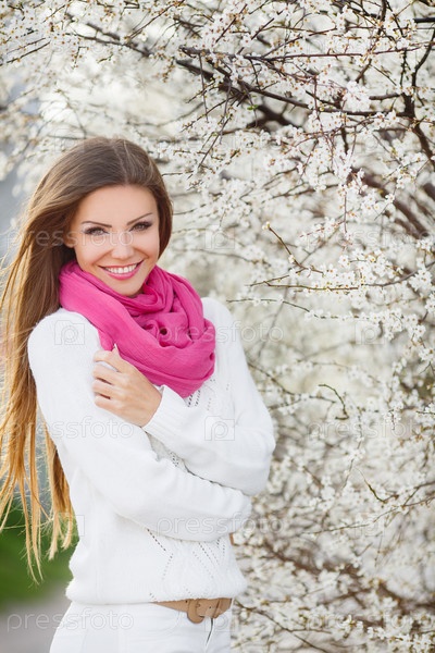 Красивая женщина в розовом шарфе, на фоне цветущего дерева