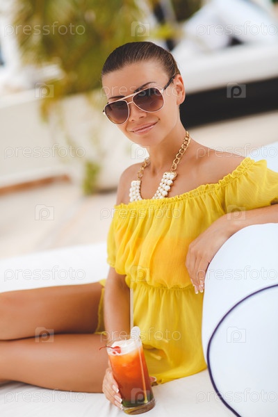 Красивая женщина, отдыхающая с коктейлем
