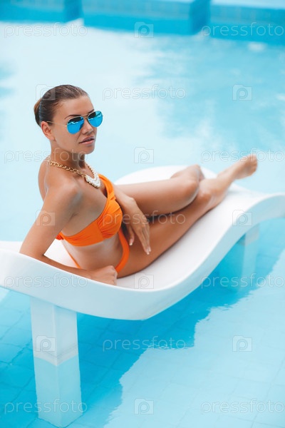 Красивая женщина в оранжевом купальнике, позирует на камеру