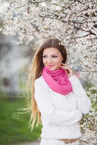 Красивая женщина, одетая в розовый шарф, на фоне цветущего дерева