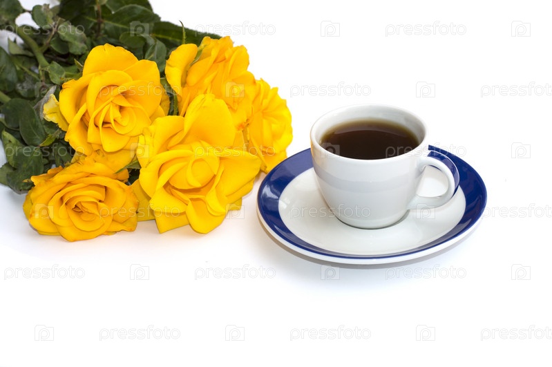 Чашка кофе на белом блюдце и букет из желтых роз