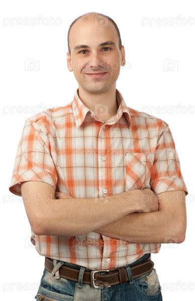 Улыбающийся мужчина со скрещенными руками на белом фоне