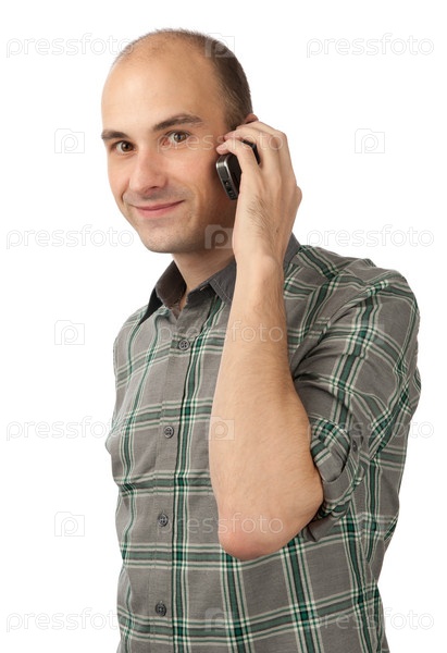 Мужчина с мобильным телефоном на белом фоне