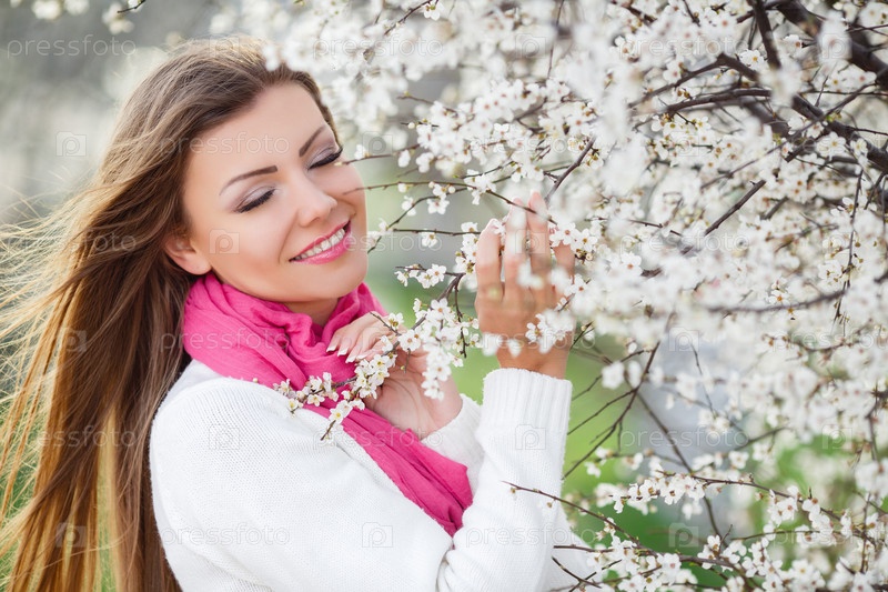 Красивая женщина в розовом шарфе, на фоне цветущего дерева