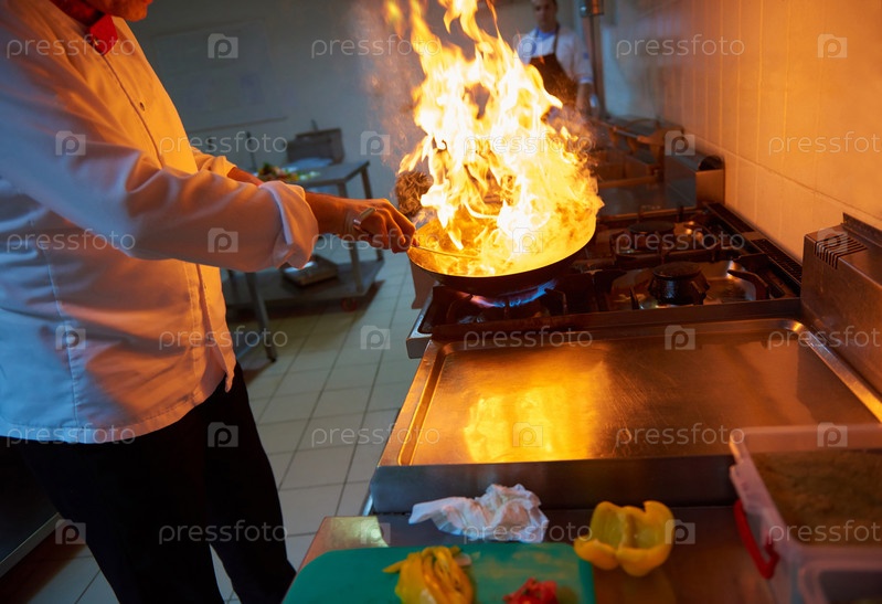 Шеф-повар отеля кухне готовить пищу с огнем
