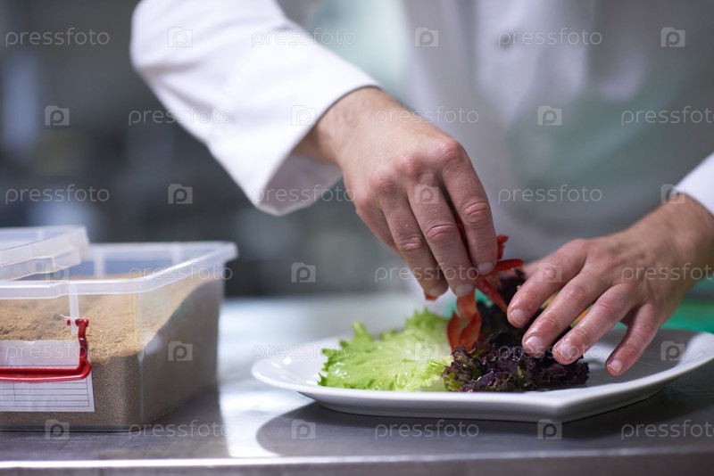Шеф-повар отеля кухне готовит и украшения продуктов питания