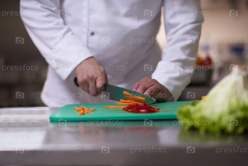 Шеф-повар в отеле кухня кусочек овощей с ножом