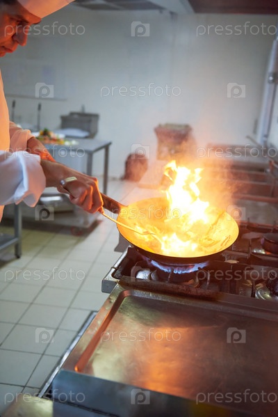 Шеф-повар отеля кухне готовить пищу с огнем