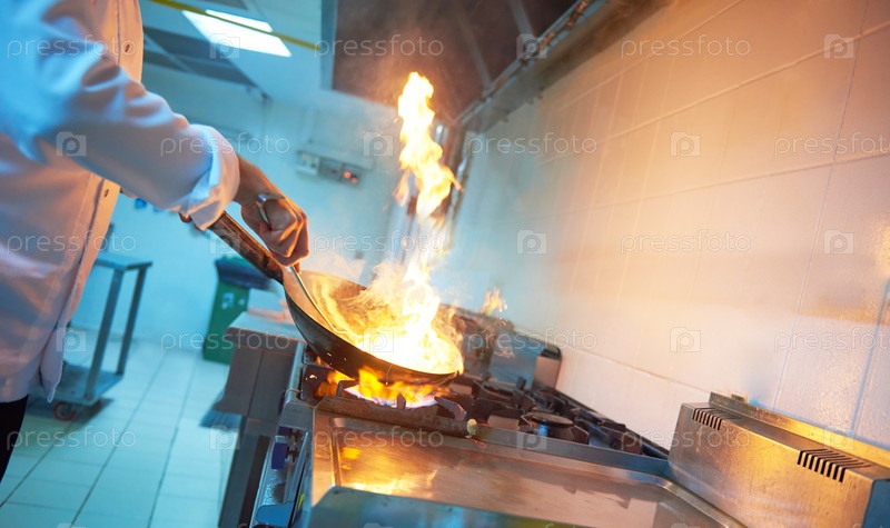 Шеф-повар отеля кухне готовить пищу с огнем