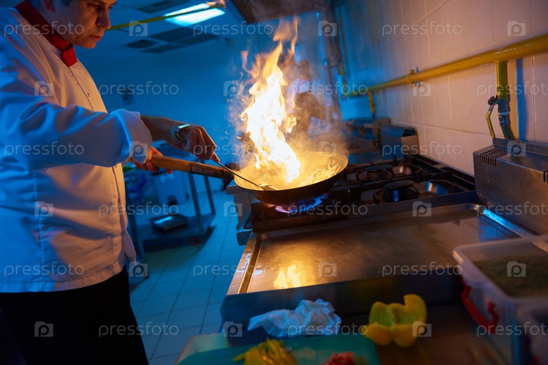 Шеф-повар отеля кухне готовить пищу с огнем