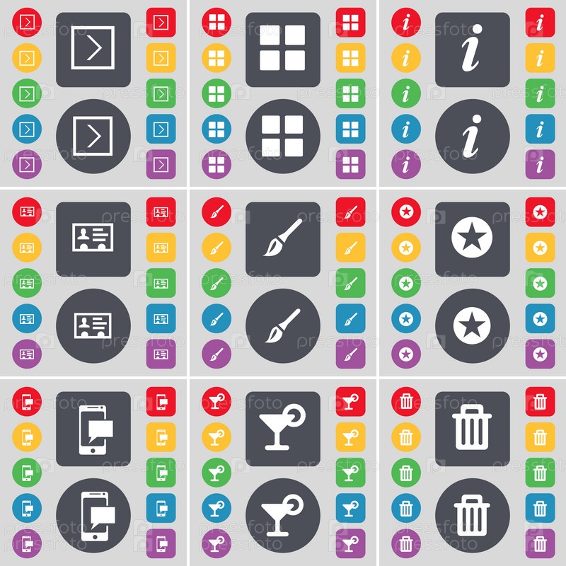 Стрелка справа, приложения, информация, контакт, кисть, звезда, SMS, коктейль, мусор может значок символа. большой набор плоских цветных кнопок для вашего дизайна. вектор